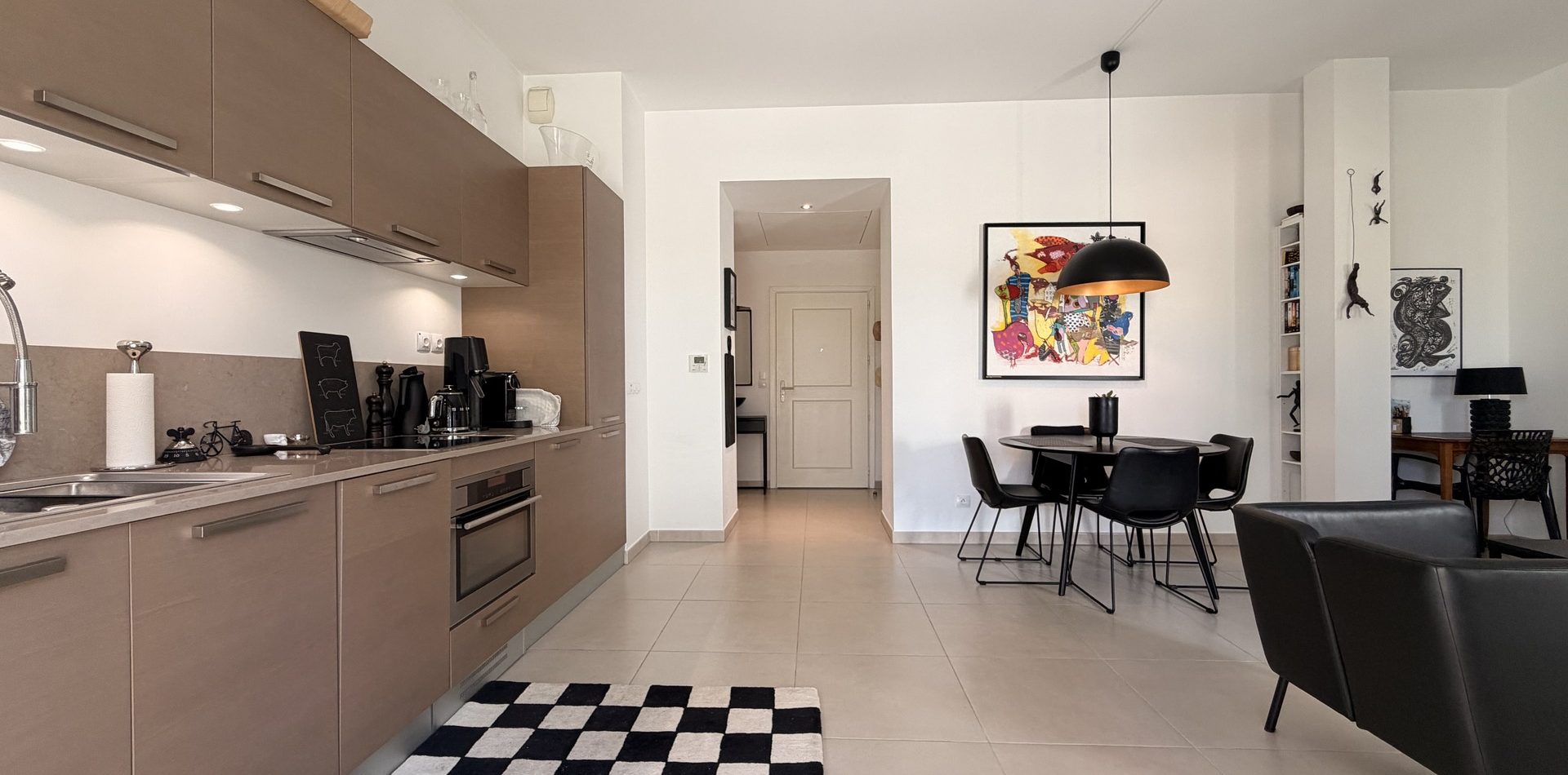 Cet appartement comprend une entrée, un séjour avec cuisine américaine entièrement équipée de 30,25 m2, une chambre de 15 m2 avec placards, une grande salle de bains avec WC et un toilette indépendant.