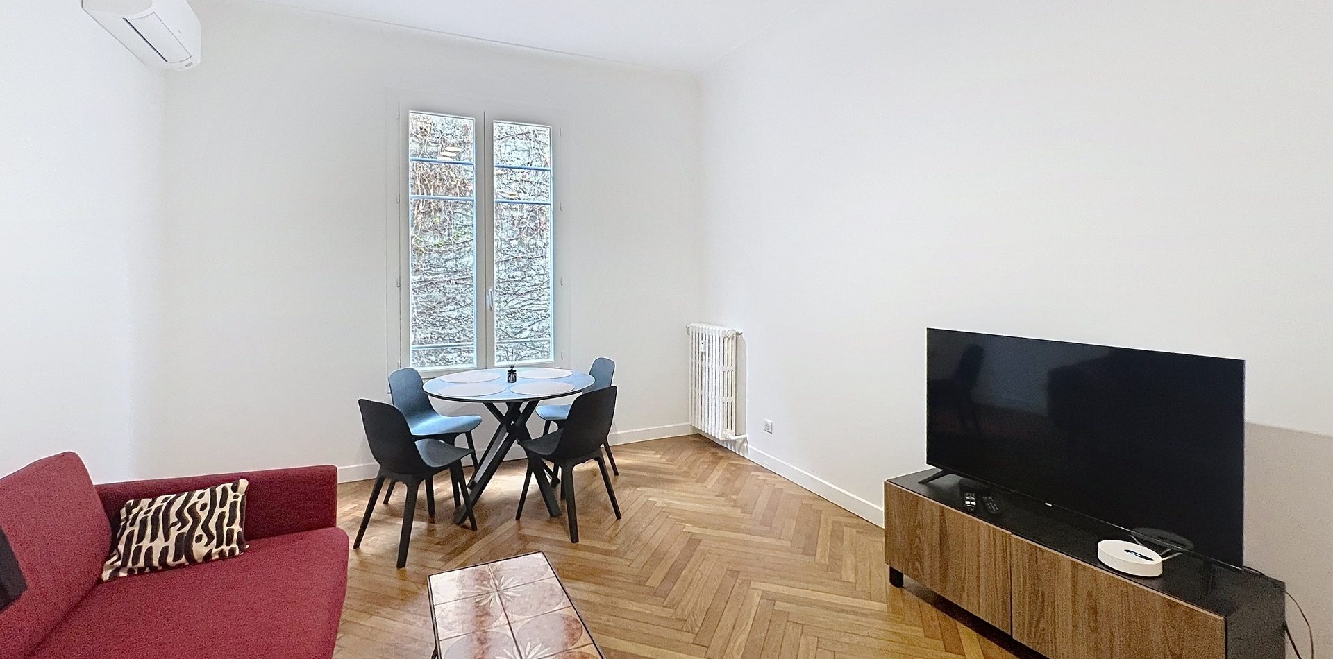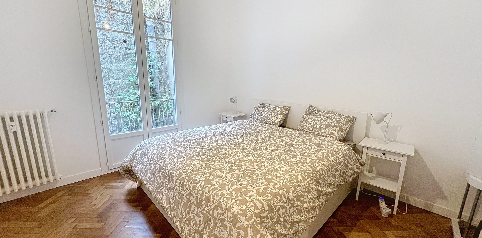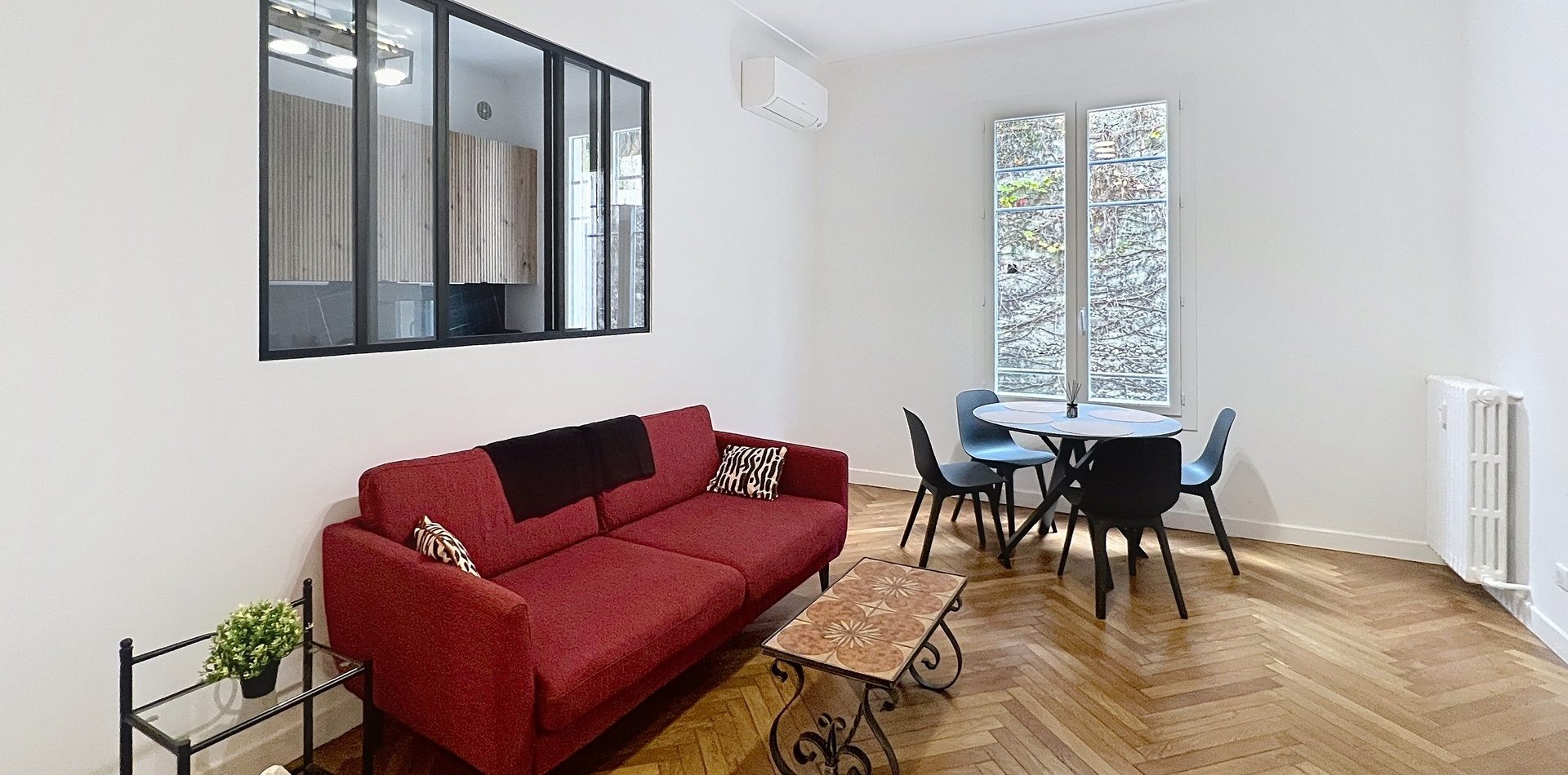 Cet appartement, meublé avec goût et dans un esprit contemporain, allie le charme de l’ancien et le confort moderne. Il se compose d’un vaste séjour avec très belle hauteur sous plafond et climatisé, d’une cuisine indépendante parfaitement équipée, et de deux belles chambres avec parquet offrant calme et rangements optimisés. La salle de bain, moderne et fonctionnelle, complète l’ensemble avec élégance.