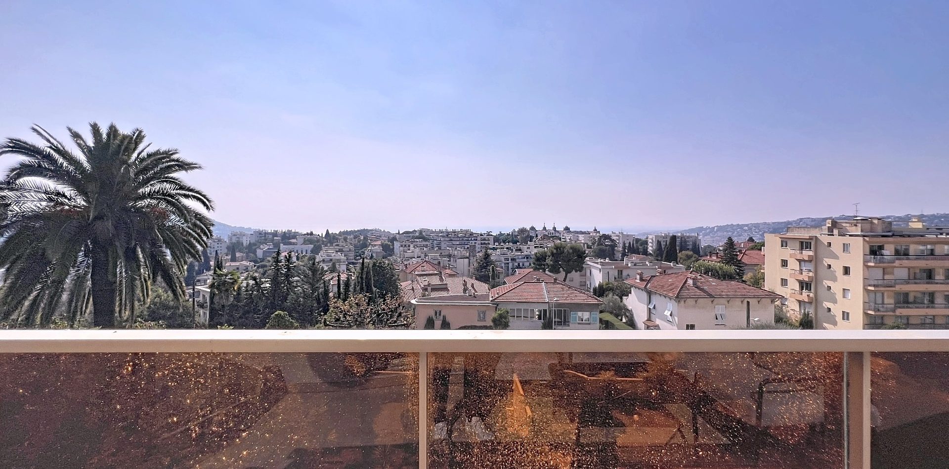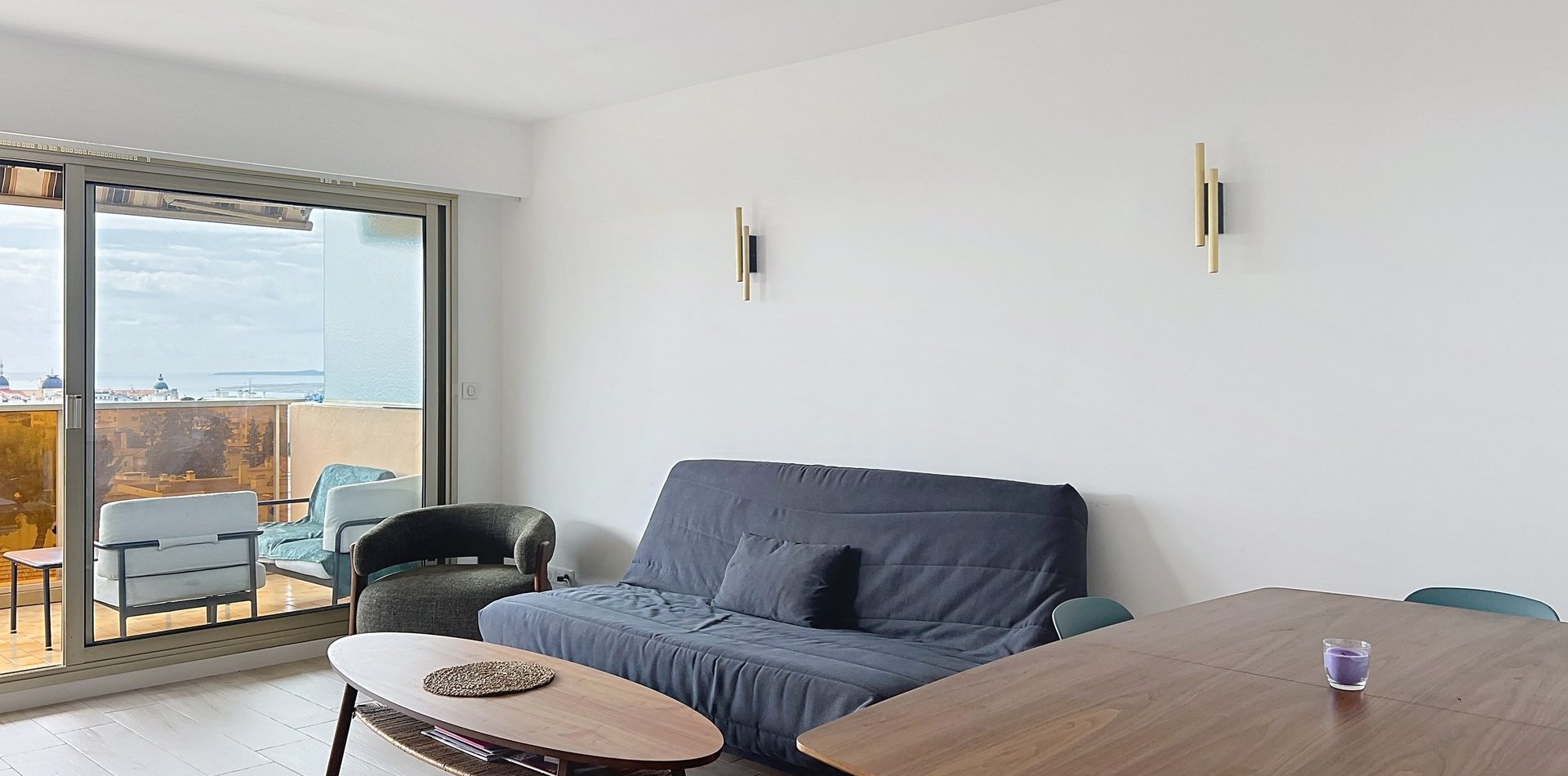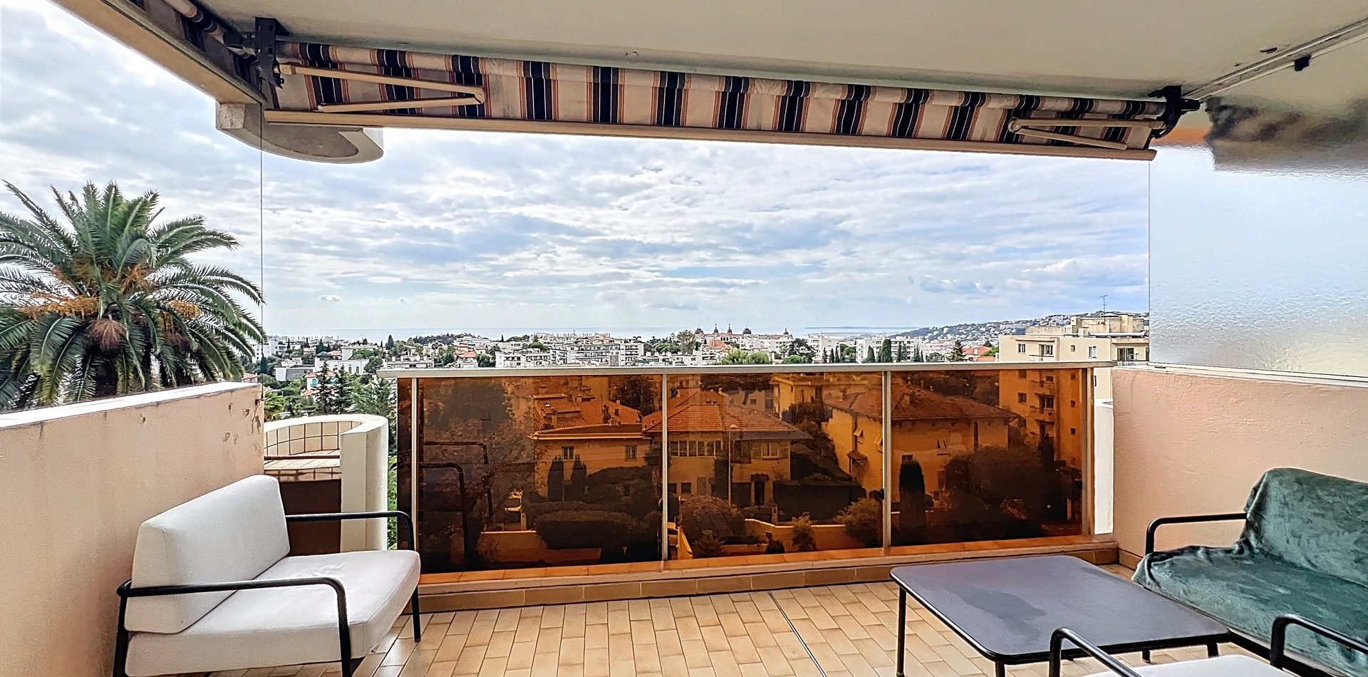 Le vaste séjour, exposé plein Sud, s’ouvre sur une belle terrasse offrant une vue panoramique sur Cimiez et la mer. Sans vis-à-vis, il bénéficie d’une atmosphère paisible et d’une belle hauteur sous plafond, idéale pour profiter du soleil azuréen toute l’année.