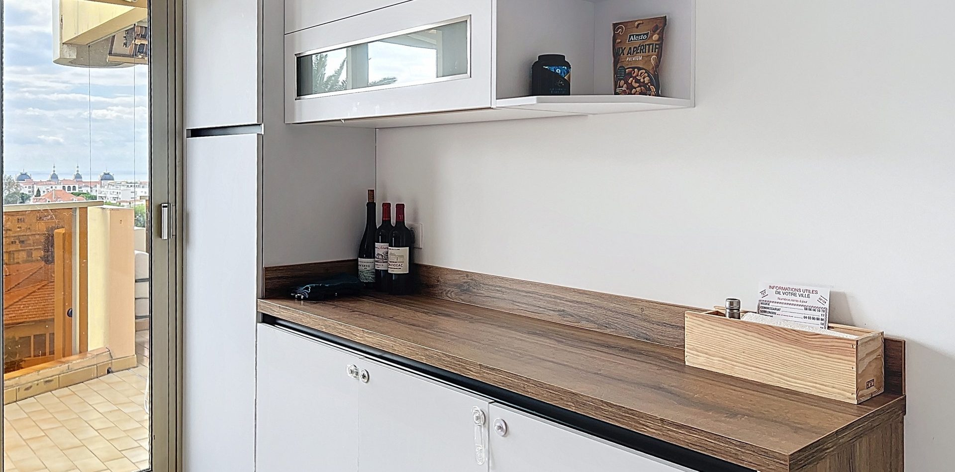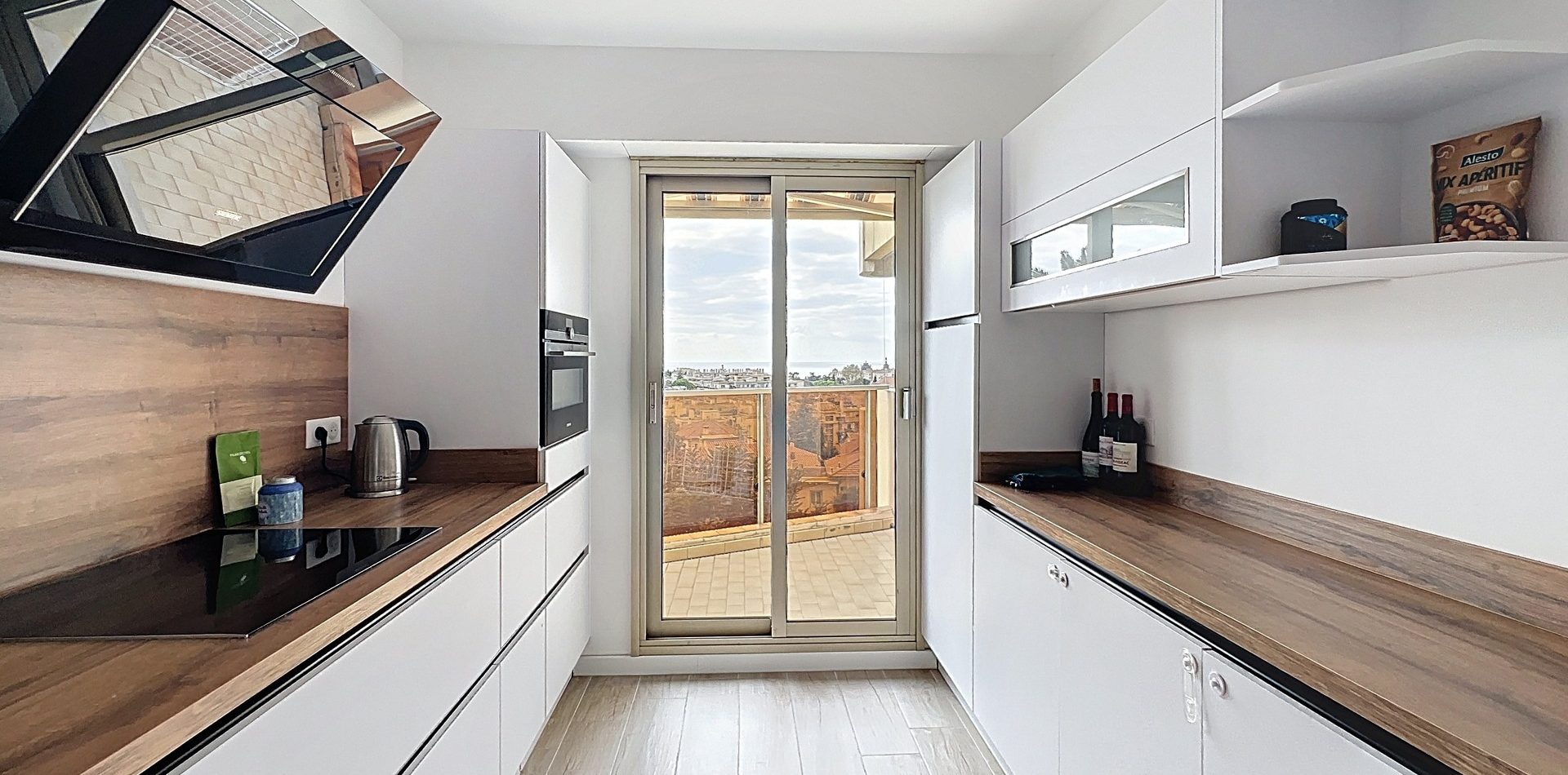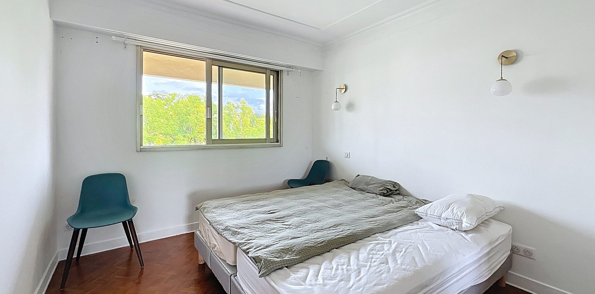 Le vaste séjour, exposé plein Sud, s’ouvre sur une belle terrasse offrant une vue panoramique sur Cimiez et la mer. Sans vis-à-vis, il bénéficie d’une atmosphère paisible et d’une belle hauteur sous plafond, idéale pour profiter du soleil azuréen toute l’année.